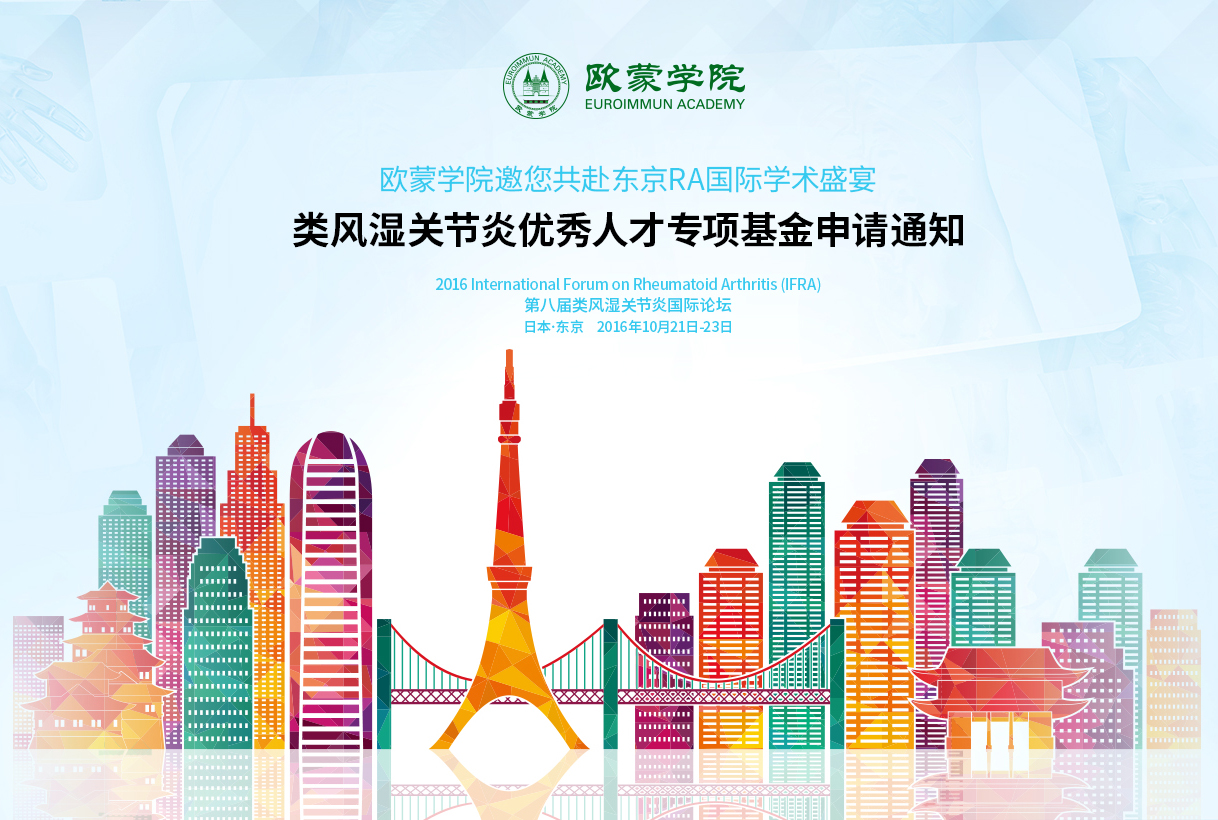 第八屆“類風(fēng)濕關(guān)節(jié)炎國際論壇(IFRA)”將于2016年10月21~23日在日本東京召開,該論壇為風(fēng)濕領(lǐng)域的國際性學(xué)術(shù)盛會。歐蒙學(xué)院秉承“分享前沿知識,推動醫(yī)學(xué)教育”的宗旨,以提高疾病的行業(yè)診斷水平為愿景,為推動類風(fēng)濕關(guān)節(jié)炎(RA)疾病的醫(yī)療學(xué)術(shù)發(fā)展,特設(shè)立“歐蒙學(xué)院——類風(fēng)濕關(guān)節(jié)炎優(yōu)秀人才”專項基金,由歐蒙學(xué)院資助RA領(lǐng)域的優(yōu)秀人才赴東京參會。