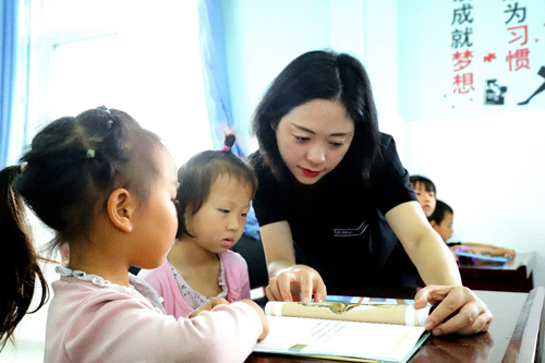 志愿者和孩子們在愛心圖書閱讀角