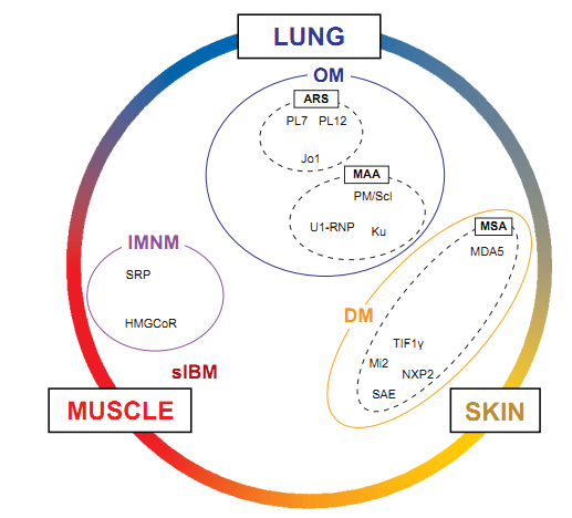 皮肌炎是一種主要累及橫紋肌,以淋巴細(xì)胞浸潤為主的非化膿性炎癥病變,可伴有或不伴有多種皮膚損害,常累及多種臟器。如累及呼吸肌可導(dǎo)致呼吸無力,排痰困難,肺部感染。最嚴(yán)重的并發(fā)癥是急進(jìn)型肺泡炎,表現(xiàn)為發(fā)熱、氣短、劇咳,快速進(jìn)展的呼吸困難,嚴(yán)重者可導(dǎo)致成人呼吸窘迫綜合征。此外,間質(zhì)性肺病(ILD)也是肌炎患者主要的致病和致死因素,ILD的發(fā)生與抗ARS抗體、抗MDA5抗體和抗PM-Scl抗體相關(guān)。檢測患者血清中的肌炎抗體譜,對(duì)于肌炎的臨床診斷非常重要,也可幫助新冠病毒肺炎進(jìn)行鑒別診斷。