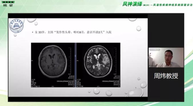 周煒教授首先圍繞“系統(tǒng)性紅斑狼瘡累及的神經(jīng)系統(tǒng)損害”這一主題為在線同仁帶來了精彩的學(xué)術(shù)報(bào)告分享。周教授通過幾個(gè)神經(jīng)精神性狼瘡(NPSLE)真實(shí)病例對(duì)SLE神經(jīng)系統(tǒng)受累進(jìn)行了詳細(xì)的解讀。他認(rèn)為,SLE神經(jīng)系統(tǒng)受累發(fā)生機(jī)制復(fù)雜,臨床表現(xiàn)形式多樣,早期診治存在一定困難性。近些年有研究表明,SLE或許與某些自身抗體相關(guān),但是由于目前NPSLE的診斷還缺乏特異性的生物標(biāo)志物,因此仍然要結(jié)合臨床表現(xiàn)等進(jìn)行診斷。另外,對(duì)于SLE引發(fā)的神經(jīng)系統(tǒng)受累還存在哪些對(duì)疾病診療有提示作用的臨床表現(xiàn),還需要更多有力的研究數(shù)據(jù)進(jìn)行支持。
