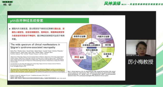 接下來,厲小梅教授又針對(duì)干燥綜合征引發(fā)的神經(jīng)系統(tǒng)受累進(jìn)行了詳細(xì)的講解。厲小梅教授指出干燥綜合征(SS)除了口腔和眼部受累外,還可影響人體多個(gè)系統(tǒng)。其中神經(jīng)受累是SS常見的腺外表現(xiàn)之一:周圍神經(jīng)和中樞神經(jīng)系統(tǒng)均可發(fā)生病變,但周圍神經(jīng)系統(tǒng)病變更為多見,且臨床表現(xiàn)多樣;而中樞神經(jīng)系統(tǒng)病變發(fā)病率相對(duì)較低,臨床表現(xiàn)主要以頭痛和認(rèn)知功能障礙為主。此外,厲小梅教授指出為了減少漏診和誤診,疾病的臨床診斷不止要依賴臨床表現(xiàn),還需結(jié)合實(shí)驗(yàn)室檢測(cè)結(jié)果進(jìn)行確認(rèn)。她強(qiáng)調(diào)了SS相關(guān)的血清學(xué)檢測(cè)指標(biāo)ANA、抗SSA抗體、抗SSB抗體等的臨床意義,并且提到呈抗SSA抗體陽(yáng)性的患者更容易出現(xiàn)無先兆偏頭痛。