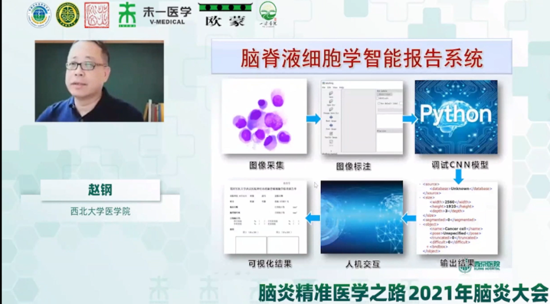 首先趙鋼教授做題為《神經感染性疾病人工智能體系搭建》學術報告。報告中,趙鋼教授生動形象地介紹了人工智能在醫(yī)學領域的發(fā)展歷程,國內已從經驗醫(yī)學發(fā)展到了智能醫(yī)學。趙鋼教授介紹其科研團隊借助人工智能搭建了腦膜炎人工智能輔助診斷決策系統(tǒng)、腦脊液細胞學智能報告系統(tǒng)及腦脊液mNGS精準醫(yī)學智能診斷系統(tǒng),為臨床診斷、腦脊液細胞學診斷、病原學診斷及藥物敏感性診斷方面提供了快速、準確的新型武器,為感染性疾病的診斷和未來的治療方面提供了新的手段,是精準醫(yī)療的未來發(fā)展趨勢。
