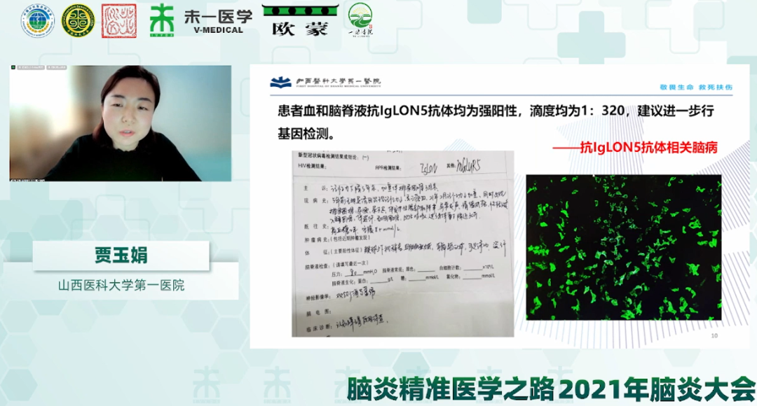 在病例分享環(huán)節(jié),山東省立醫(yī)院汪春娟博士介紹了一例根據腦脊液mNGS及免疫功能評價等輔助檢查結果確診為進行性多灶性白質腦病的病例;北京協(xié)和醫(yī)院劉曼歌博士分享了基于TBA法實驗結果發(fā)現一例與AP3B2抗體相關的自身免疫性小腦性共濟失調的病例;山西醫(yī)科大學第一醫(yī)院賈玉娟博士以《“一紙訴求”的感悟》為題,結合在臨床中的工作,分享一例抗IgLON5抗體相關腦病的病例,根據臨床癥狀對特殊抗體進行檢測,體現了臨床與實驗室密切結合的重要性。