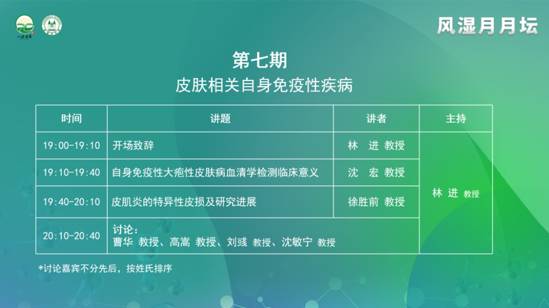 林進(jìn)教授首先表示非常高興與各位同道、各位專家線上相見,參與到一味書院舉辦的第七期風(fēng)濕月月壇中,非常榮幸能夠以線上的形式與大家相聚,一同暢談皮膚相關(guān)自身免疫性疾病的臨床意義及探索。近年來,我們對(duì)自身免疫病性疾病的關(guān)注程度不斷提高,診療技術(shù)日新月異,皮膚相關(guān)自身免疫病性疾病取得研究成果比較顯著;但部分診斷和治療方案具有個(gè)體化差異,隨著對(duì)疾病發(fā)病機(jī)制的深入研究,還需要進(jìn)一步實(shí)現(xiàn)精準(zhǔn)診斷與治療。