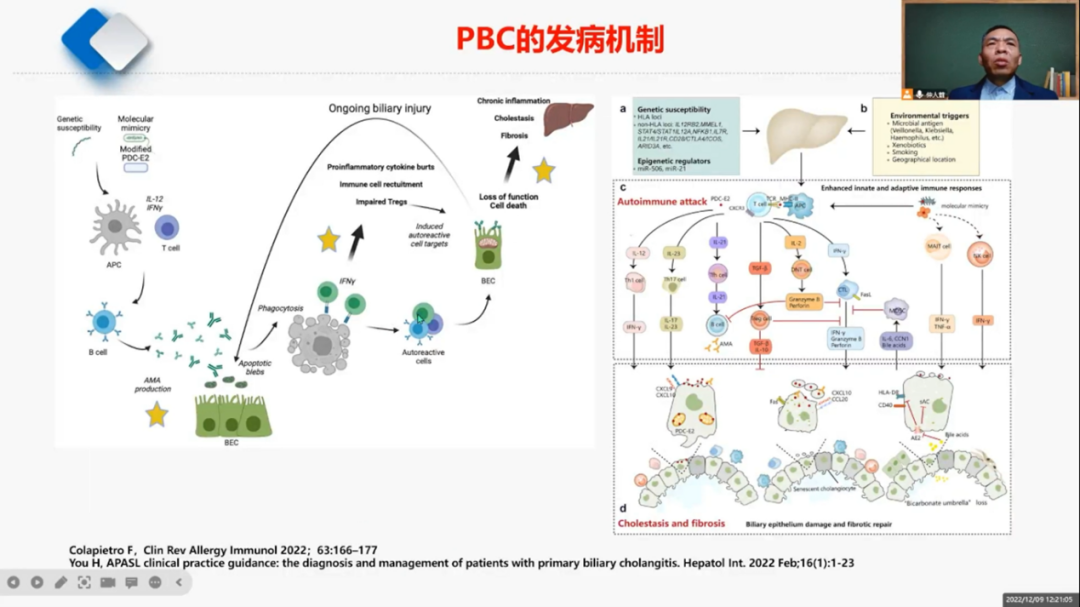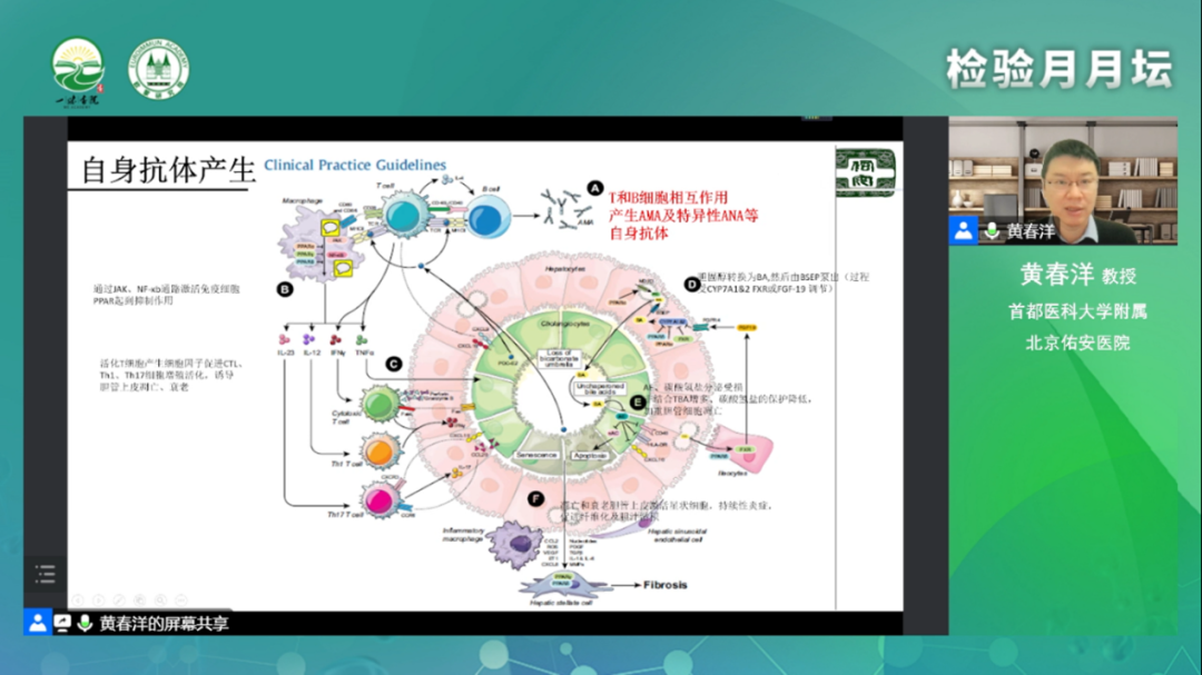 學(xué)術(shù)分享環(huán)節(jié)的最后,黃春洋教授指出自身抗體在自身免疫性肝病的診斷及預(yù)后判斷的作用。本次會議的講題就是從自身抗體的角度來看一下PBC有哪些疾病特點。主要分享從PBC自身抗體的產(chǎn)生、PBC自身抗體的分布以及不同自身抗體陽性PBC的特點三大部分展開。首先黃教授對PBC疾病的定義以及自身抗體產(chǎn)生的機制進行了簡要的介紹,他指出PBC是一種由自身免疫反應(yīng)介導(dǎo)、慢性的、進行性膽汁淤積性肝病。PBC的臨床特點包括膽汁淤積、相關(guān)自身抗體陽性及特征性的肝臟病理變化。黃教授對自身抗體做了大篇幅地講解。自身抗體的產(chǎn)生基因及環(huán)境等因素相關(guān),免疫耐受打破。隨后,黃教授又利用多篇研究數(shù)據(jù)介紹了自身抗體檢測體對PBC診斷及病情預(yù)后判斷的作用。他強調(diào),抗線粒體抗體(AMA),它是PBC的血清學(xué)診斷標志,其M2亞型診斷PBC的靈敏度和特異度高達95%以上,但也可以出現(xiàn)在其他肝病患者,多表現(xiàn)為低滴度自身抗體。除此之外,黃教授又結(jié)合自身多年的臨床實踐經(jīng)驗,對抗著絲點抗體(ACA)、抗210抗體等ANA特異性檢測指標在PBC中的預(yù)后及診療價值一一進行了詳細地介紹。最后,黃春洋教授對上述自身抗體在PBC診療過程中的作用進行了總結(jié)。