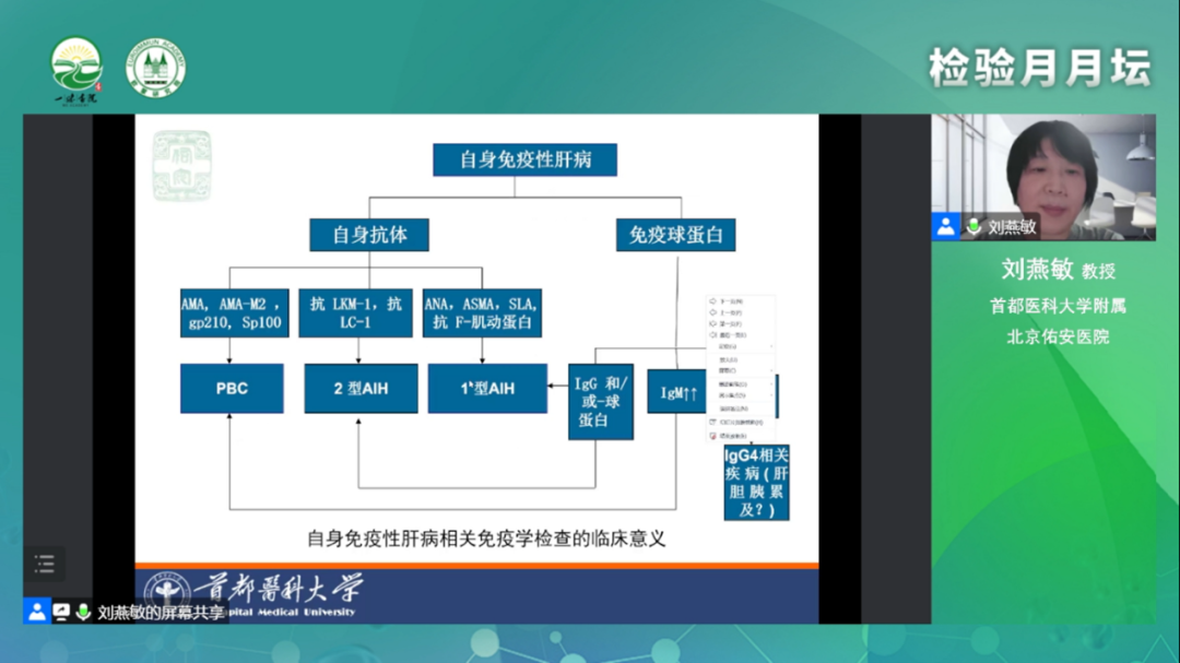 接著,劉燕敏教授為我們介紹了自身抗體的概念、簡介。自身抗體是診斷自身免疫性肝病重要指標,一些非特異性自身抗體也可以出現(xiàn)在其他肝病中。肝臟疾病合并自身抗體陽性有三種情況:自身免疫性肝病、其他原因肝病合并自身免疫性肝病以及非自身免疫性肝病伴免疫現(xiàn)象。劉教授就這三種情況各自展開介紹。先介紹了自身免疫性肝病的分類、相關(guān)免疫學(xué)檢查的臨床意義、自免肝相關(guān)抗體及其臨床意義、原發(fā)性膽汁性膽管炎相關(guān)抗體及其臨床意義,劉教授指出自身抗體是診斷自身免疫性肝病的主要特征之一,但不是所有的自身抗體陽性伴肝功異常都診斷自身免疫性肝病。接下來劉教授講述了其他原因肝病合并自身免疫性肝病,如病毒性肝炎合并自身免疫性肝病,介紹了病毒性肝炎的病毒性指標,指出慢性病毒性感染合并自身免疫性肝病常難以識別和確診,容易造成延誤診斷。對于病毒性肝炎合并AIH的患者,AIH的診斷往往落后于病毒性肝炎,AIH的最終診斷應(yīng)基于血清學(xué)特征、組織學(xué)發(fā)現(xiàn)、評分系統(tǒng)、治療反應(yīng)和結(jié)果。與單純PBC患者相比,合并HCV感染的PBC患者更容易并發(fā)肝癌,PBC合并HCV感染的患者比合并HBV感染的患者更容易發(fā)生肝硬化,且預(yù)后較差。劉教授還列舉了幾個臨床案例向我們展示了其他原因肝病合并自身免疫性肝病的臨床特點、臨床診治過程。最后劉教授介紹了非自身免疫性肝病伴免疫現(xiàn)象。對非自身免疫性肝病伴免疫現(xiàn)象,需鑒別HCV感染、藥物性肝損傷、非酒精性脂肪性肝病、Wilson病。