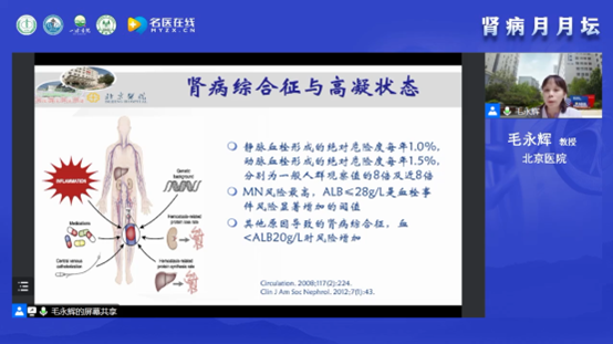 毛教授為論壇做了膜性腎病感染和血栓并發癥診治的精彩報告,她強調二者都是膜性腎病的主要并發癥,疾病兇險,臨床需要重視且合理處理。KDIGO指南指出MN患者應減少免疫抑制劑相關副反應,其中包括感染潛在風險的篩查。免疫抑制劑是一把雙刃劍,使用過程中需要關注感染的副作用。毛教授在講解發病機制時,提到免疫功能受損宿主包括中性粒細胞減少或功能障礙、體液免疫缺陷和細胞免疫缺陷三方面,主要見于激素及免疫抑制劑使用、器官移植受者、新型腫瘤療法等患者。免疫受損的類型與感染微生物的種類相關,如抗T細胞治療導致細胞免疫異常,將特別增加真菌和弓形蟲的感染以及皰疹病毒再激活。臨床可通過細詢問多聯想、可疑部位取標本找證據、借助影像學以及必要時候進行穿刺、活檢等有創操作,以盡早識別微生物感染。在免疫功能受損個體的治療中,特異性微生物學的診斷非常重要。隨后,毛教授講授了常見病原體感染的診治。同時,MN患者發生血栓栓塞并發癥是腎病綜合征中風險最高的,其中白蛋白水平是評估血栓事件風險的重要指標。KDIGO 2021 指出腎病綜合征的膜性腎病患者的預防性抗凝治療應基于對血栓事件和出血性并發癥風險的評估,綜合評估結果決策抗凝治療方案。毛教授對中國專家提出的KDIGO指南關于膜性腎病預防性抗凝方案合理性討論的發聲進行了細致分析。最后,她強調臨床應重視膜性腎病預防性抗凝的選擇,最新指南在此方面做了較大改動,標志著對該領域的持續探索和進步,未來也需要更多的循證證據來完善治療方案。