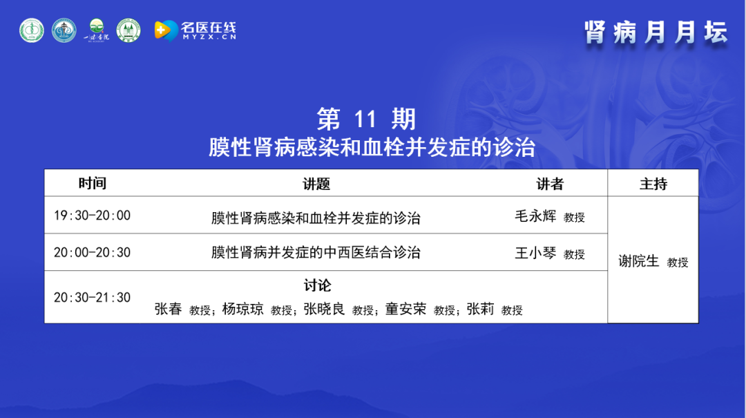 眾所周知,腎臟病患病率很高,特別是膜性腎病,在腎病綜合征的腎活檢比率中占據首位。膜性腎病的無創診斷和治療手段日新月異,而且膜性腎病的異質性很大。基于此背景,“腎病月月壇”自2022年5月17日開始舉辦,在每個月的第三周的星期二晚上,每月一期,每期一個主題,已經舉辦了十期,包括”激素和免疫抑制劑在膜性腎病的合理應用”、“利妥昔單抗在膜性腎病的合理應用”、“原發性和繼發性膜性腎病的鑒別”、“中醫對膜性腎病的認識”、“膜性腎病的抗原分類及發病機制”、“膜性腎病的臨床表現、無創診斷和病理診斷”、“膜性腎病的自發緩解和非免疫抑制治療”、“非典型膜性腎病的病理表現及鑒別診斷思路”、“膜性腎病與腫瘤”、“膜性腎病的流行病學與研究歷程”。本期是該論壇的第11期,主題是“膜性腎病感染和血栓并發癥的診治”。在膜性腎病的發展和治療過程中,常常遇到感染并發癥和血栓并發癥,經常會影響膜性腎病的轉歸和預后,有時治療的很好突然感染又復發了,有時治療的很困難可能是感染沒有控制或血栓的形成,針對這些問題,本期專門邀請的講者和討論嘉賓都是業內非常著名的臨床專家、博士生導師、腎內科主任、業內大咖,具有豐富的臨床、教學和科研經驗,相信他們的分享一定會對大家的臨床診療有所幫助。