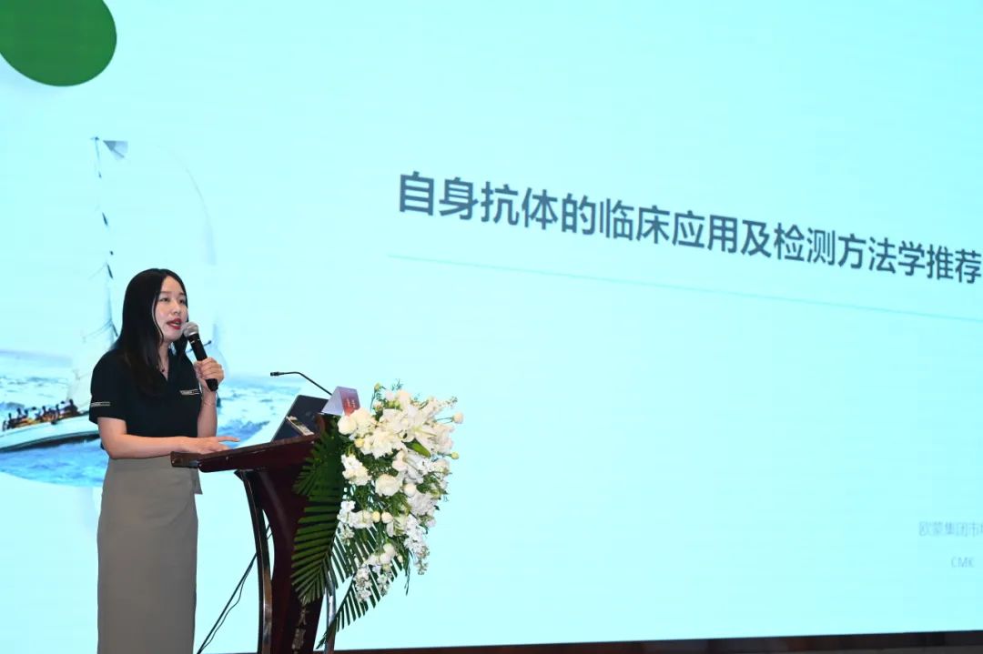朱女士進(jìn)行了題為“自身抗體的臨床應(yīng)用及檢測(cè)方法學(xué)推薦”的學(xué)術(shù)報(bào)告,作為本次會(huì)議的承辦單位,她首先代表歐蒙公司對(duì)各位遠(yuǎn)道而來的老師表示了感謝。她指出,自身抗體在自身免疫性疾病診療過程中的很多環(huán)節(jié)都具有重要的應(yīng)用價(jià)值,如預(yù)測(cè)、診斷、鑒別診斷、治療監(jiān)測(cè)和預(yù)后評(píng)估等。截至目前用于自身抗體檢測(cè)的方法學(xué)非常豐富,除了經(jīng)典的IIF、ELISA、放射免疫法及免疫印跡法之外,還有被逐步應(yīng)用于自身免疫性疾病領(lǐng)域的化學(xué)發(fā)光法。作為ANA檢測(cè)的金標(biāo)準(zhǔn),IIF通常被用作進(jìn)行總抗體的篩查,它憑借著自己的諸多優(yōu)勢(shì),在自身抗體檢測(cè)方面始終無可替代。免疫印跡法,在特異性抗體確認(rèn)方面,一直以來應(yīng)用率都是最高的,占了80%左右,且經(jīng)過了長(zhǎng)年的臨床驗(yàn)證,其檢測(cè)性能也是非常穩(wěn)定的。化學(xué)發(fā)光法,在自身抗體檢測(cè)領(lǐng)域應(yīng)用率越來越高,近兩年NCCL室間質(zhì)評(píng)數(shù)據(jù)顯示,在ANA特異性抗體確認(rèn)方面有10%以上的實(shí)驗(yàn)室都已開展了化學(xué)發(fā)光法。