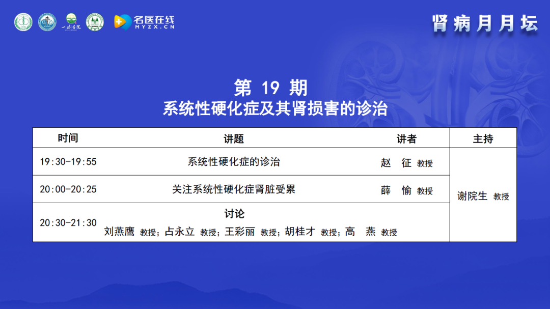 謝教授介紹腎病月月壇自2022年5月線上舉辦后受到全國同仁的支持和歡迎。學術活動開始主要聚焦于膜性腎病,后逐漸擴展到新冠相關性多學科論壇及風濕病相關腎損害。在論壇內容上,以臨床需求和臨床問題為導向,體現中醫和西醫的結合、腎科和其他學科的結合;在形式上,體現以講座、病例分享和點評討論相結合。本期討論和學術交流的主要內容是系統性硬化癥及其腎損害的診治,邀請的講者和討論嘉賓都是風濕科和腎內科在系統性硬化癥領域很有經驗的專家,相信能為大家帶來有價值的內容。