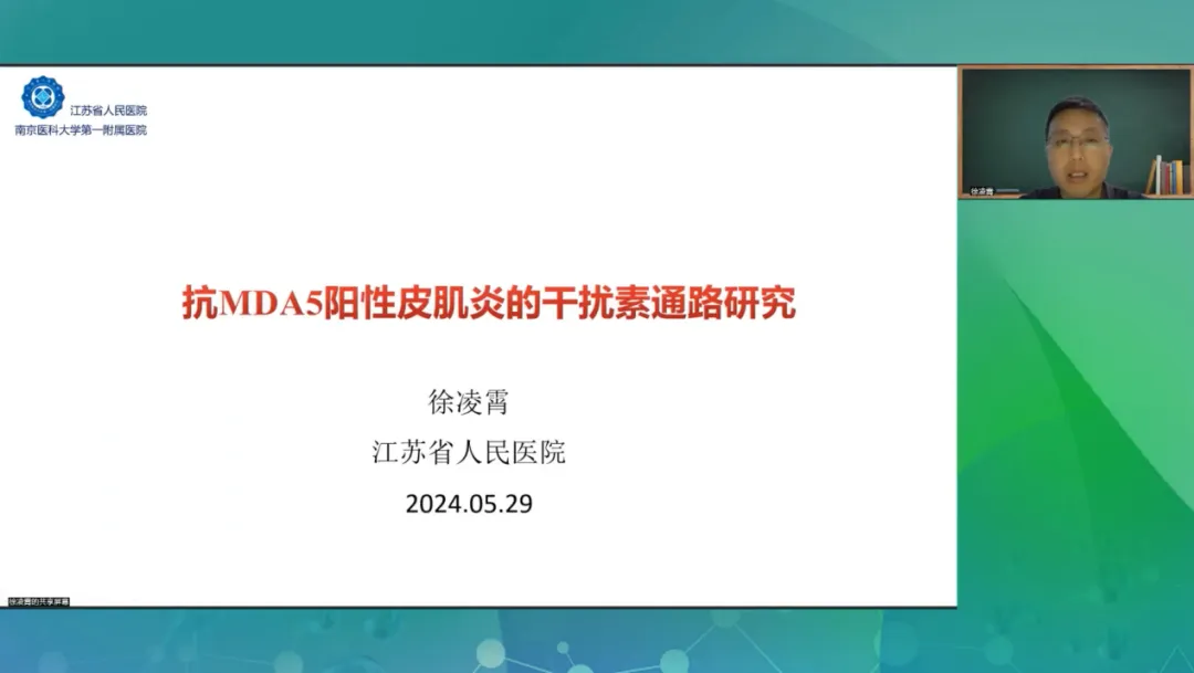 徐凌霄博士首先介紹了MDA5陽性皮肌炎的臨床癥狀及基因調控機制,MDA5陽性皮肌炎是一種常見的自身免疫性疾病,表現為皮疹、潰瘍、瘢痕性脫發、鈣質沉積等。還詳細介紹了MDA5基因結構,蛋白結構域及功能域,MDA5+皮肌炎與RP的合并,使得治療抵抗差,死亡率高。此外,MDA5+皮肌炎還可能與中性粒細胞、單核細胞等亞群細胞的高表達有關,其過渡或過度激活可能與干擾素通路密切相關。