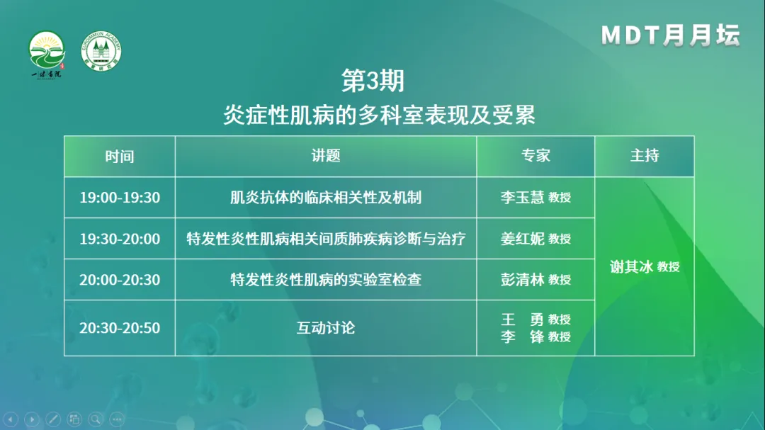 2023年7月18日(周二),由一味書院主辦的《MDT月月壇(第3期)—炎癥性肌病的多科室表現及受累》于線上成功舉行。本次論壇由四川大學華西醫院風濕免疫科主任謝其冰教授擔任大會主席,北京大學人民醫院李玉慧教授、復旦大學附屬中山醫院廈門醫院姜紅妮教授、中日友好醫院彭清林教授作為講課嘉賓,陸軍軍醫大學西南醫院王勇教授、寧夏醫科大學總醫院李鋒教授作為本次大會的討論嘉賓。