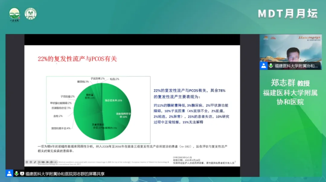 鄭教授詳細的講述了PCOS不孕癥患者先兆流產風險和流產率增加、妊娠并發癥明顯增加,并且造成子代內分泌和心血管功能障礙,以及代謝異常等不良影響;PCOS不孕癥患者妊娠風險的主要原因是胰島素抵抗、肥胖、高雄激素血癥、黃體功能不全以及高血栓; 在備孕前調整周期,生活方式干預的同時使用地屈孕酮保證月經高期及保護子宮內膜;在妊娠階段使用地屈孕酮防治流產、改善妊娠結局。她還特別提出對HCY、高血栓、不孕癥等免疫指標的關注和檢測,給出從臨床到機制,再到檢驗的一系列細致分享。