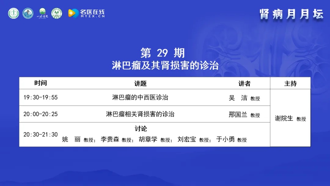 今天的主題是淋巴瘤及其腎損害的診治,很榮幸邀請到了在該領域有很深造詣的專家,包括血液病專家、臨床腎臟病專家、腎臟病理專家、中醫和西醫專家,都是一線非常有經驗的科主任,一起進行學術講座、點評與討論。