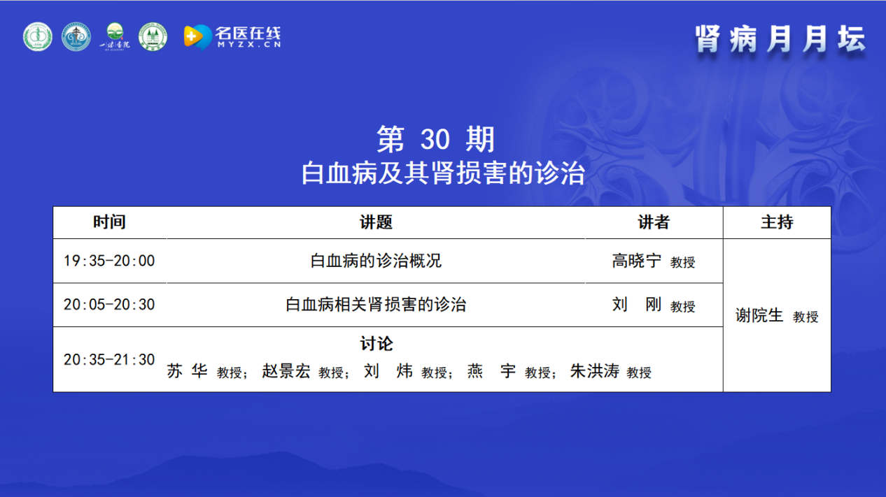 今天的主題是白血病及其腎損害的診治,很榮幸邀請(qǐng)到了在該領(lǐng)域有很深造詣的專家,包括血液病專家、腎臟病專家、成人內(nèi)科專家、兒科專家、臨床專家和病理專家,都是一線非常有經(jīng)驗(yàn)的專家,一起進(jìn)行學(xué)術(shù)講座、點(diǎn)評(píng)與討論。