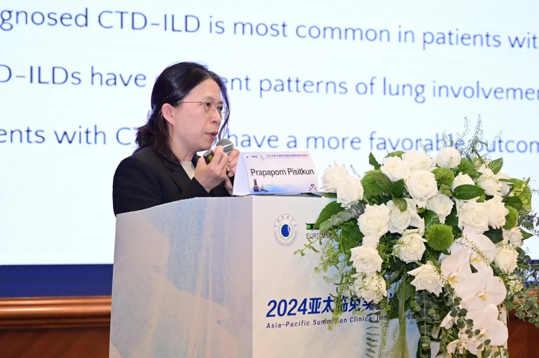 來自泰國的Prapaporn Pisitkun教授深入淺出地介紹了CTD-ILD的疾病概況、常見CTD-ILD的影像學特征、特異性自身抗體、典型的臨床癥狀及體征,以及CTD-ILD的診斷流程。她指出,CTD-ILD的早期診斷要特別關注、識別發生ILD的高危因素,從而篩選出具有發生CTD-ILD高風險的患者并加強監測和隨訪。她詳細講解了進行性纖維化(PF) -ILD的定義,并介紹了KL-6、IL-6、SP-D、CCL18等具有指導意義的生物標志物,這些標志物對病情活動性及預后評估具有重要參考價值。最后Prapaporn Pisitkun分享了一個具體案例,該患者中老年女性,以周身彌漫性疼痛和多關節痛為主要表現,無干眼、齲齒,無皮膚增厚、雷諾氏現象、吞咽困難、肌無力等,ANA1:320陽性,ESR 55mm/h,結合眼科檢查,診斷為干燥綜合征,予以硫酸羥氯喹200mgQD治療。后出現勞力性呼吸困難,胸部X線提示ILD,肌炎特異性抗體:Mi2:1+;PM-Scl75:1+,加用潑尼龍5mg BID,結合HRCT特征,最終診斷為干燥綜合征伴UIP伴PPFE(胸膜肺彈力纖維增生癥),予免疫抑制劑MMF1000mgQD治療,患者呼吸困難、關節痛緩解,但手指尖端和側面的皮膚出現粗糙和皸裂,予MMF加量至1500mgQD繼續治療和密切隨訪中。Prapaporn Pisitkun教授強調,CTD-ILD病情復雜、異質性強,治療棘手,病程中應使用HRCT和包括與ILD相關的自身抗體在內的生物標志物來識別具有急性加重或發展為進行性纖維化性ILD的高風險患者,以便及早給予適當的治療以改善預后。