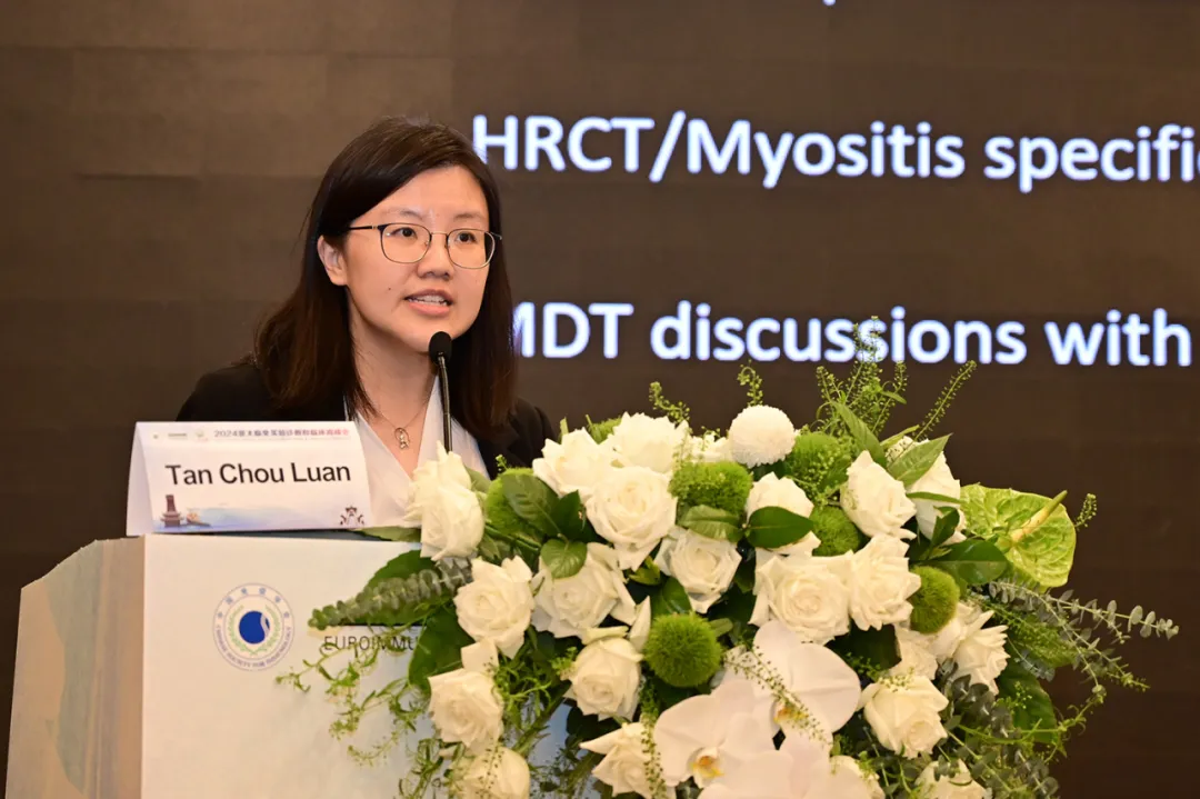 Dr. Tan Chou Luan通過一例精彩病例,引出了炎癥性肌病(IIM),并介紹了ACR/ EULAR發布的成人和青少年特發性炎癥性肌病(IIM)及其主要亞型的分類標準。該標準旨在為臨床和研究場景中提供IIM的診斷參考,通過一系列指標得分計算患者患IIM的概率。肌炎特異性自身抗體有助于肌炎的診斷、分型并被納入到新的DM分類標準中。抗合成酶綜合征的經典臨床三聯征包括:肌炎、關節炎、間質性肺病;其他臨床特征還包括:發熱、技工手、雷諾現象、肺動脈高壓等。患者通常在首診時不具備ASS典型臨床特征,如抗Jo-1抗體陽性的ASS患者常常以不完全的三聯征出現,隨疾病進展逐漸出現三聯征的兩到三個特征。ASS-ILD的臨床表現具有高度異質性,通常隱匿起病,有些患者無明顯癥狀或癥狀輕微、不易察覺。典型癥狀為慢性干咳、活動后呼吸急促,表現為呼吸困難、運動耐量下降等。部分患者無任何自覺癥狀,僅在影像學檢查中偶然發現ILD。抗Jo-1抗體(抗組氨酰tRNA合成酶抗體)是抗合成酶綜合征(ASS)中最常見的自身抗體,約占ASS患者的30-60%,尤其與多關節炎和肌肉受累密切相關。抗PL7(抗蘇氨酰tRNA合成酶)和抗PL12(抗丙氨酰tRNA合成酶)抗體也與ASS有關,且更常見于間質性肺病(ILD)的發生,并伴有更嚴重的預后。在ASS患者中,這些抗體的出現往往預示著較重的ILD表現。由于ASS-ILD具有高死亡率,及早期識別尤為關鍵。Dr. Tan Chou Luan最后指出,目前對于此類疾病的治療指南有限,未來需要更多研究以進一步探索和優化治療方案和管理策略。
