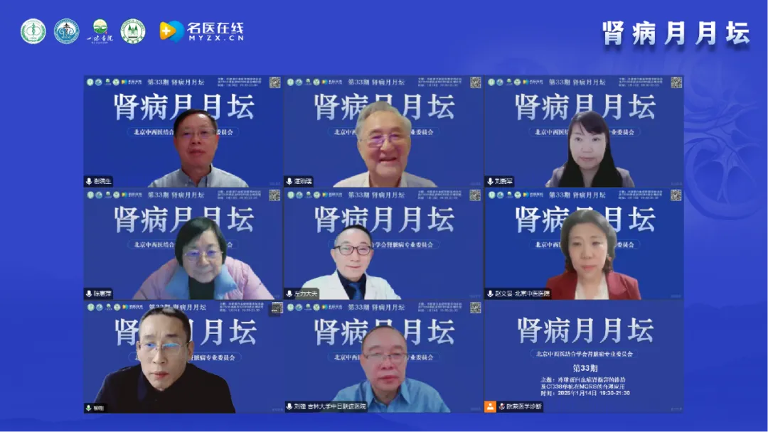 2025年1月14日,由北京中西醫結合學會腎臟病專業委員會舉辦的《腎病月月壇(第33期)——冷球蛋白血癥腎損害的診治及CD38單抗在MGRS的合理應用》于線上成功舉行。本次論壇由北京中西醫結合學會腎臟病專業委員會主任委員、北京中西醫結合腎臟疑難病會診中心主任、北京大學航天中心醫院腎內科主任醫師特聘教授、解放軍總醫院及南開大學醫學院博士生導師謝院生教授擔任大會主席,首都醫科大學附屬北京安貞醫院諶貽璞教授、首都醫科大學附屬北京朝陽醫院劉愛軍教授作為講課嘉賓;東部戰區總醫院陳惠萍教授、北京大學人民醫院左力教授、首都醫科大學附屬北京中醫醫院趙文景教授、山東大學第二醫院柳剛教授以及吉林大學白求恩第三醫院劉鋒教授作為本次大會的討論嘉賓。