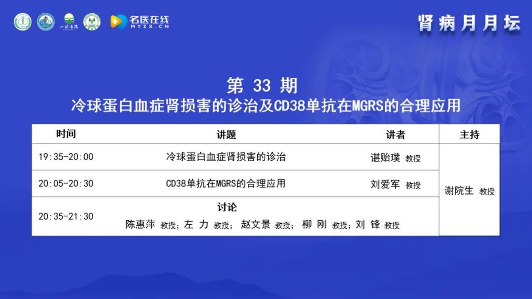 今天的主題是冷球蛋白血癥腎損害的診治及CD38單抗在MGRS的合理應用》,今天很榮幸的邀請到了腎臟病專家和血液病專家,臨床專家和病理專家,中醫專家和西醫專家,都是非常有經驗和心得的著名專家,大家一起進行學術交流與討論。